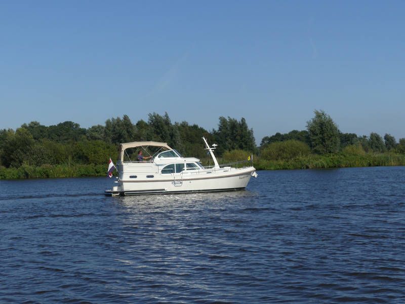 On board in the living room you can relax with a spacious sitting area with leather upholstery (which can be adjusted to a third sleeping place or lounge bed). The salon has a lot of daylight through the windows, you can really enjoy the beautiful view low over the water. The kitchen of this yacht is equipped with a complete kitchen inventory for 4-6 people, cooking and frying pans, filter coffee machine and kettle. The refrigerator has a capacity of 85 liters and is equipped with a freezer compartment and there is a three-burner gas cooker. There is a lot of storage space on board, in the form of a large hatch in the floor in the saloon, under the round seat and in cupboards in the saloon and in the sleeping cabins. In the owner's cabin there is a French bed with a luxurious mattress and slatted base. The second bed is located in the sleeping cabin at the rear, with plenty of cupboard space and its own sanitary room. Bed linen and pillows are provided. The beds in both bedrooms will be made! The two sanitary rooms have an electric toilet and sink and one separate shower room with teak bench. The ship has a boiler (24 litres) for sufficient hot water. Along the gangways you can easily step on either side of the ship or on the bathing platform. On the bathing platform there is a bun with, among other things, the gas bottle (safely off board) and a stainless steel bathing ladder is available. There is also a second shower with hot and cold water on the bathing platform. This ship has extra handles to safely enter the aft deck via the bathing platform.
