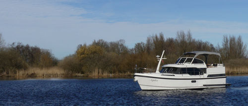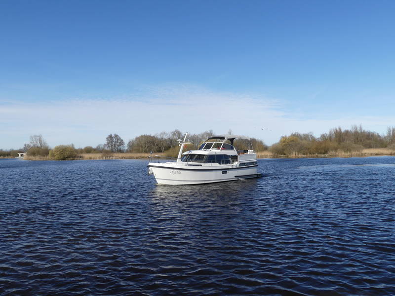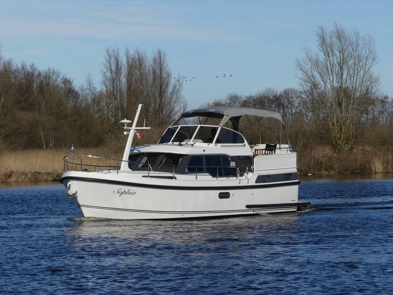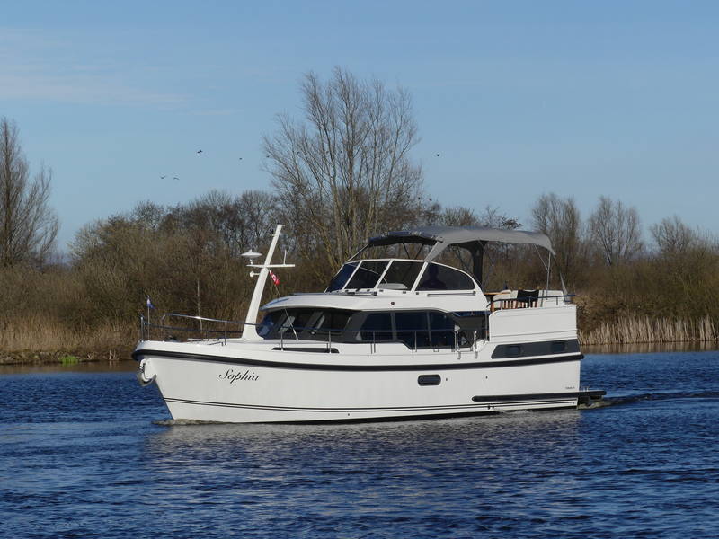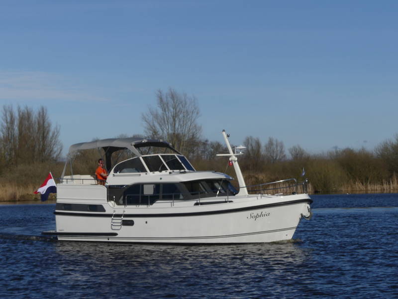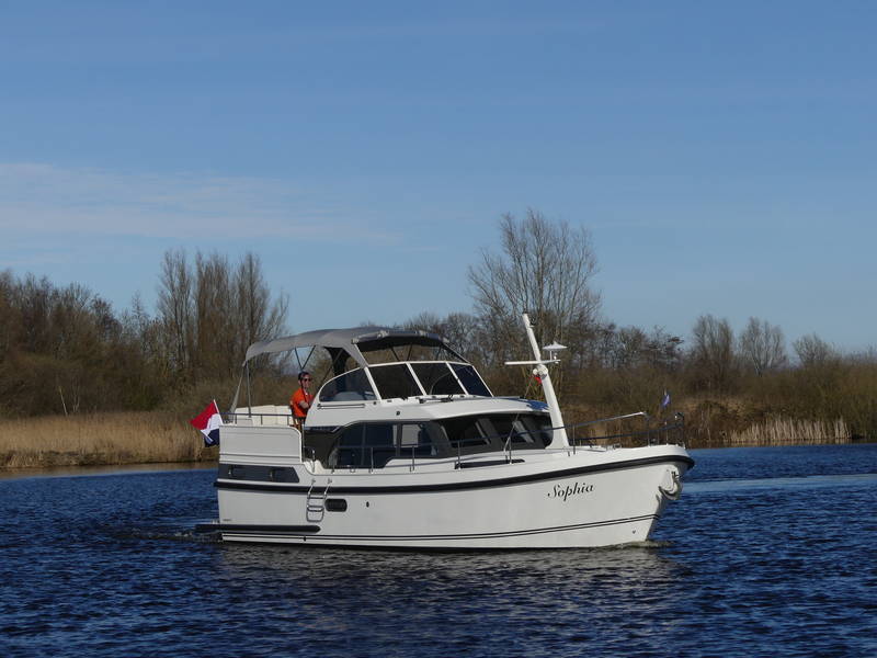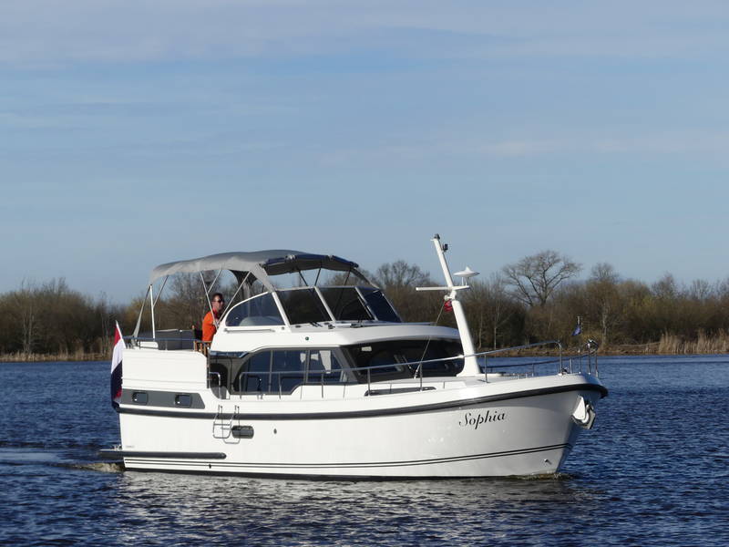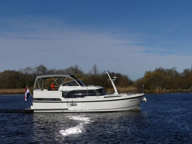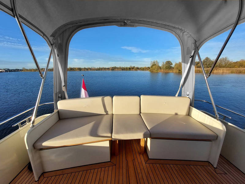 An ideal yacht for sailing on the Frisian lakes. With the steering position on the upper deck you can sail in the open air, the adjustable convertible top makes sailing in all seasons a fantastic experience!
