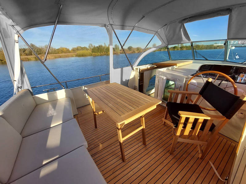 The Linssen Grand Sturdy 35.0 AC Romina has a spacious upper deck with a very extensive control and navigation system including bow and stern thrusters. Also heated by less nice weather it is pleasant to stay on board and while sailing.