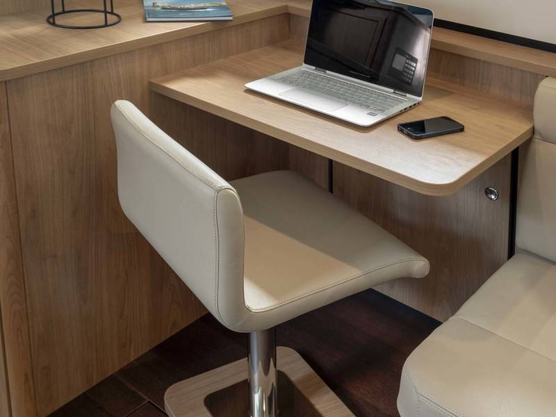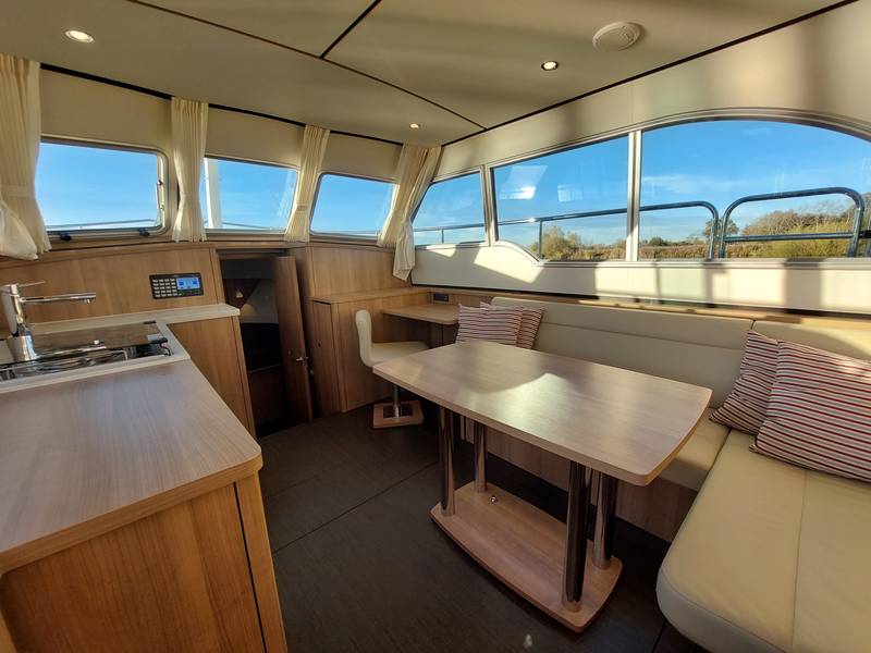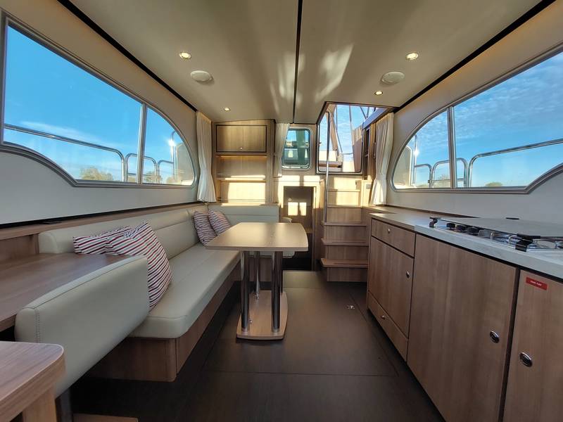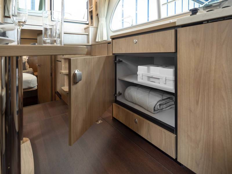On board in the saloon you can relax with a spacious sitting area with leather upholstery (which can be adjusted to a third sleeping place or lounge bed). The salon has a lot of daylight through the windows, you can really enjoy the beautiful view low over the water. In the saloon there is also a large storage hatch in the hold to store all profiant.