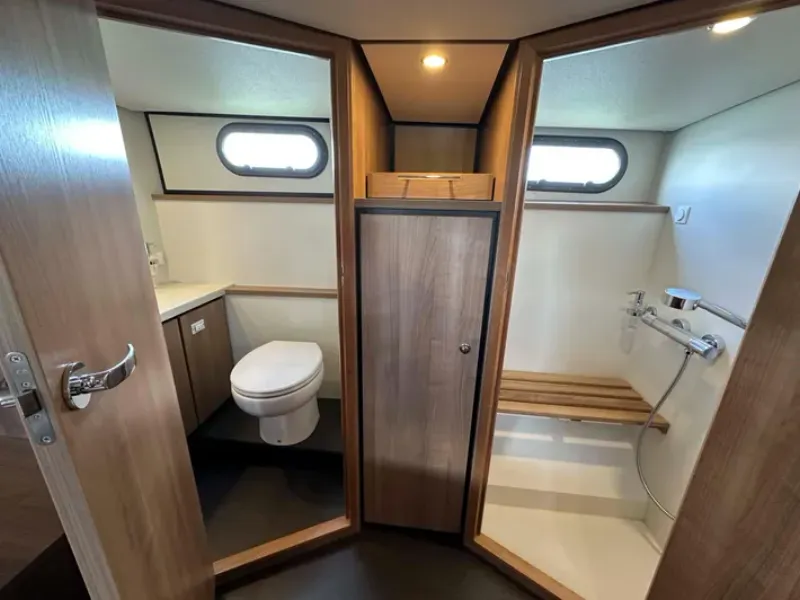 The two sanitary rooms have an electric toilet and sink and one separate shower room with teak bench. The ship has a boiler (24 litres) for sufficient hot water. Along the gangways you can easily step on either side of the ship or on the bathing platform.