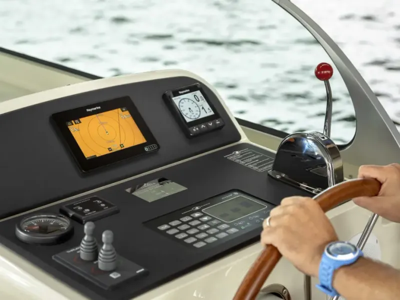 You can easily operate this Linssen Grand Sturdy 35.0 from the spacious deck, with the bow and stern thrusters lending a helping hand. Present log and indicators are of the Raymarine brand, including: rudder angle indicator, depth gauge and speedometer, GPS, log and chartplotter autopilot.