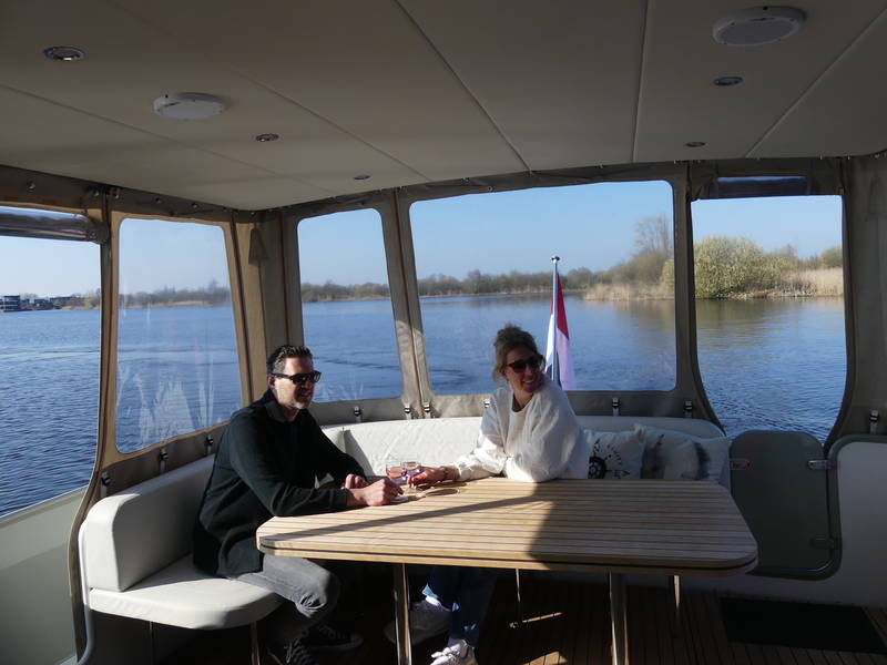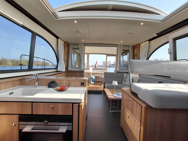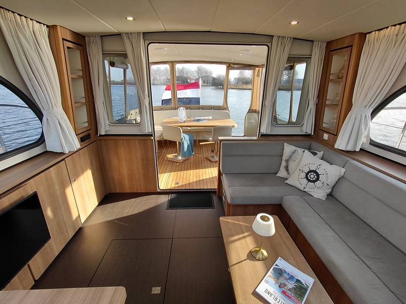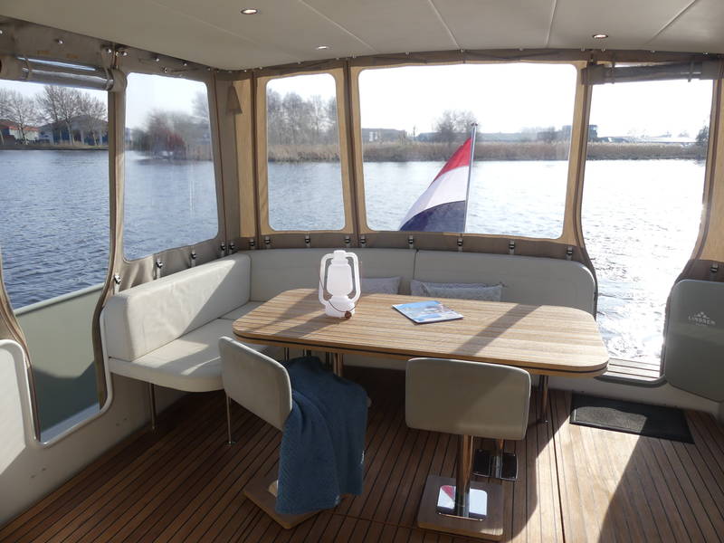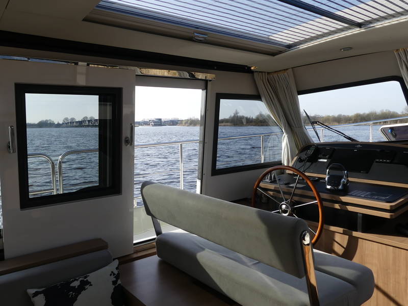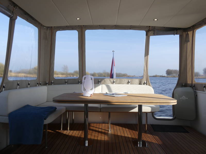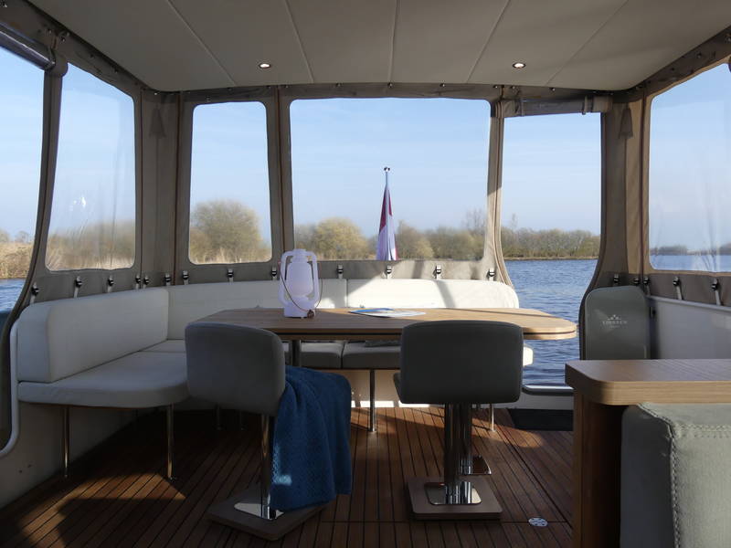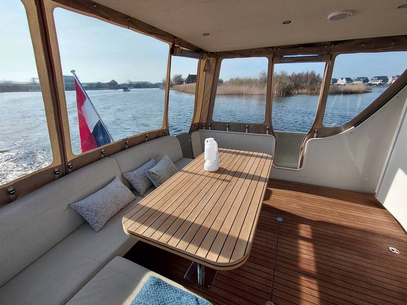 An ideal yacht for sailing on the Frisian lakes. With the steering position on the upper deck you can sail in the open air, the adjustable convertible top makes sailing in all seasons a fantastic experience!