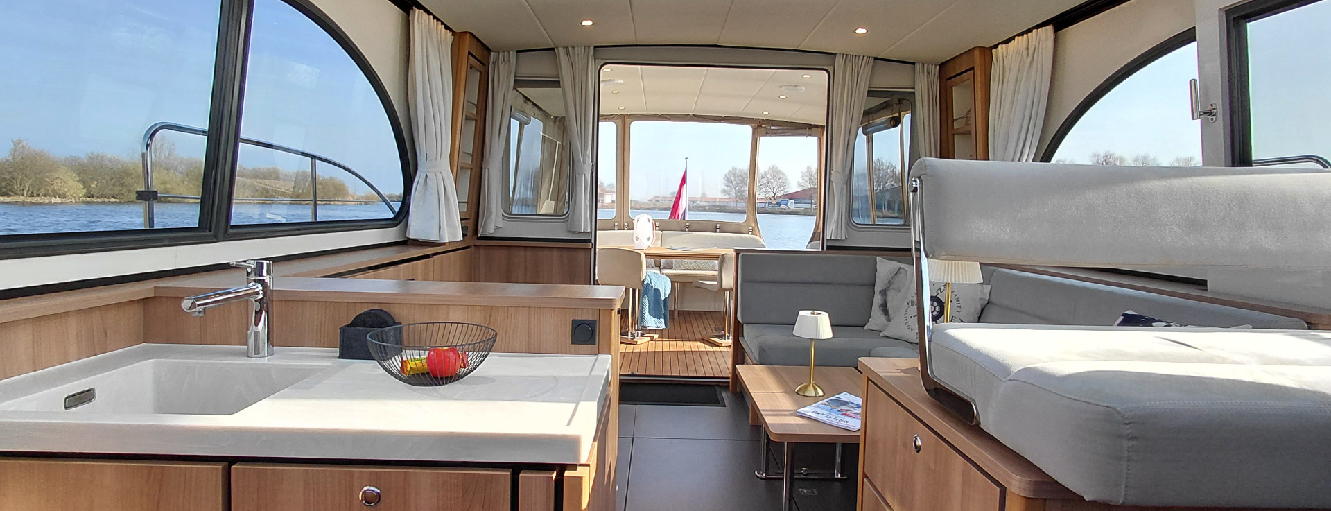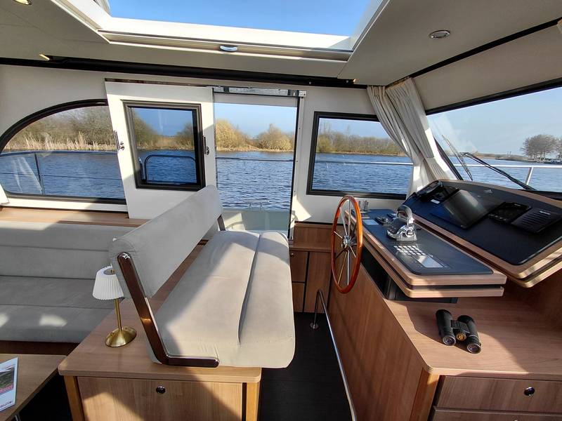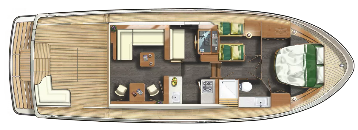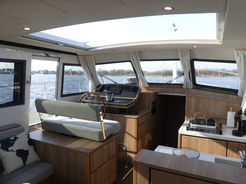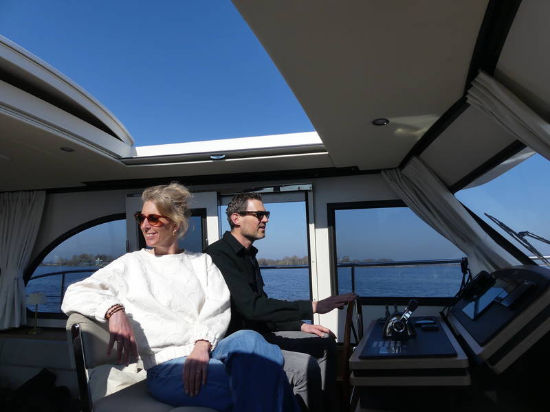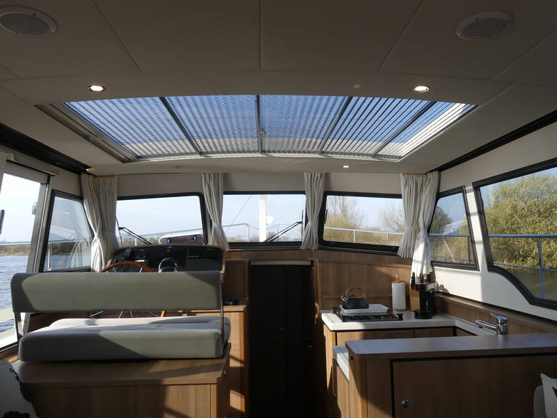 An ideal yacht for sailing on the Frisian lakes. With the steering position on the upper deck you can sail in the open air, the adjustable convertible top makes sailing in all seasons a fantastic experience!