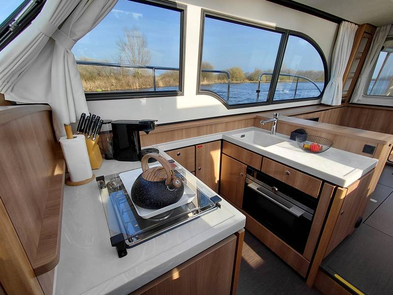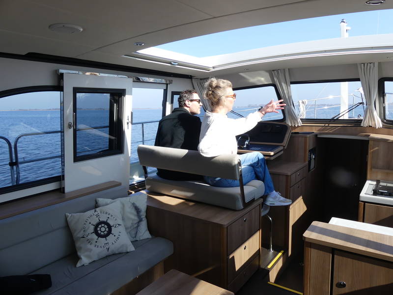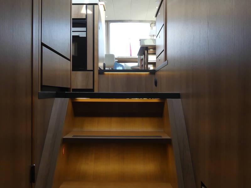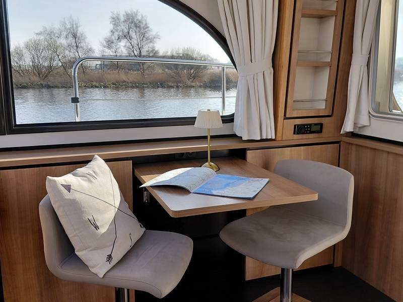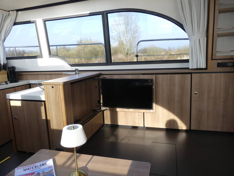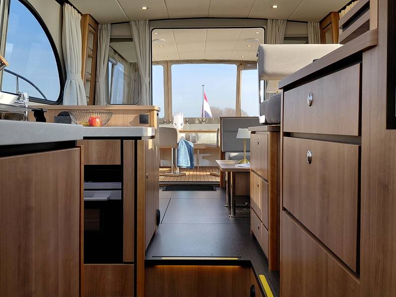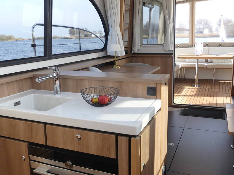 On board in the saloon you can relax with a spacious sitting area with leather upholstery (which can be adjusted to a third sleeping place or lounge bed). The salon has a lot of daylight through the windows, you can really enjoy the beautiful view low over the water. In the saloon there is also a large storage hatch in the hold to store all profiant.