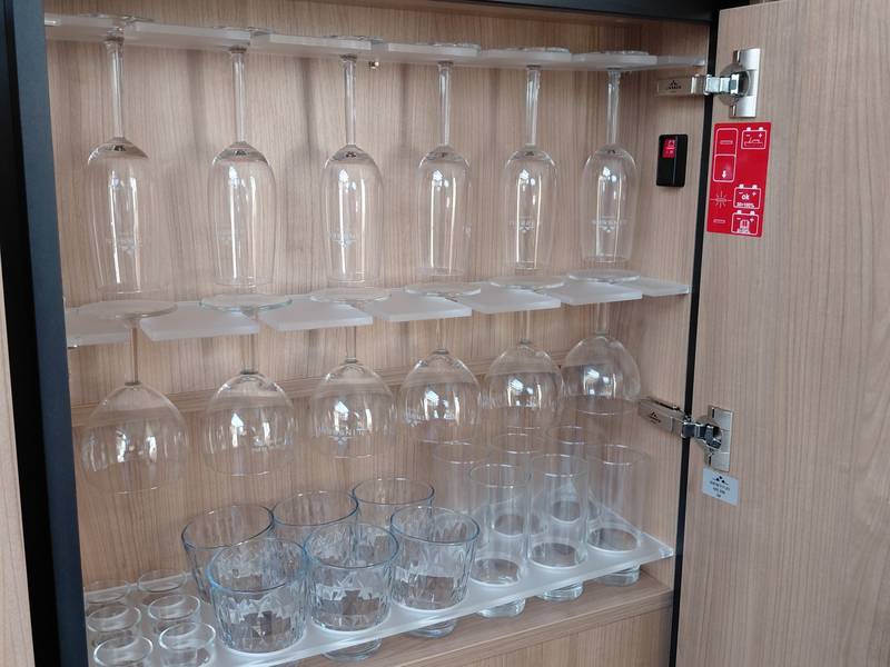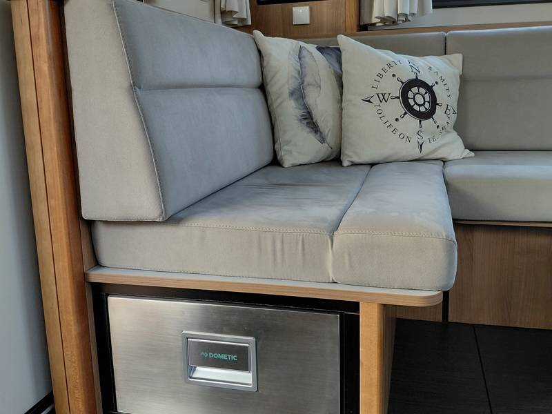 The kitchen of this yacht is equipped with a complete kitchen inventory for 4-6 people, cooking and frying pans, filter coffee machine and kettle. The refrigerator has a capacity of 85 liters and is equipped with a freezer compartment and there is a three-burner gas cooker. There is a lot of storage space on board, in the form of a large hatch in the floor in the saloon, under the round seat and in cupboards in the saloon and in the sleeping cabins.