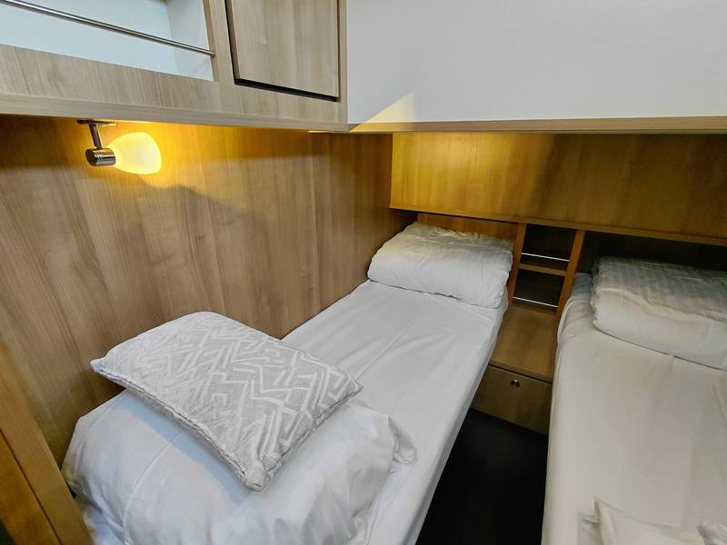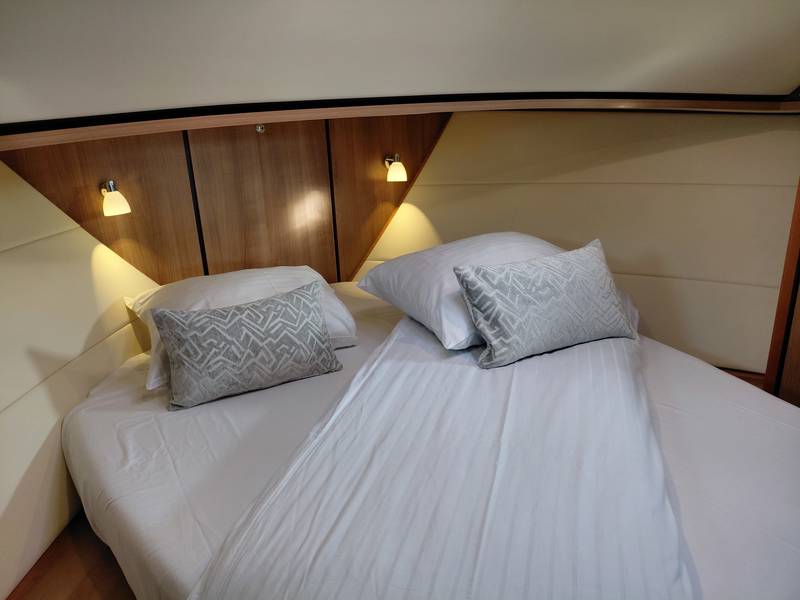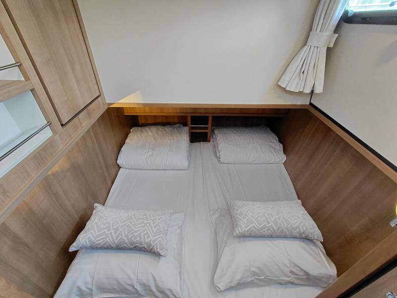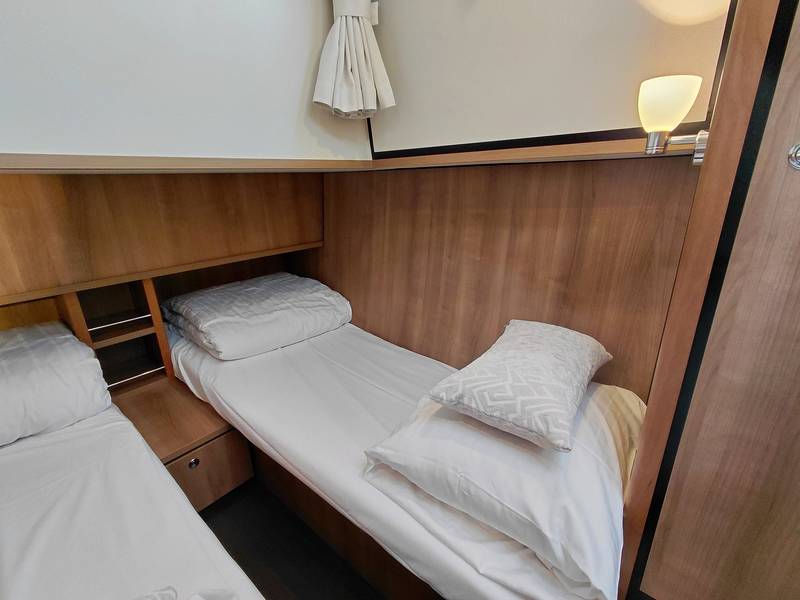 In the owner's cabin there is a French bed with a luxurious mattress and slatted base. The second bed is located in the sleeping cabin at the rear, with plenty of cupboard space and its own sanitary room. Bed linen and pillows are provided. The beds in both bedrooms will be made!