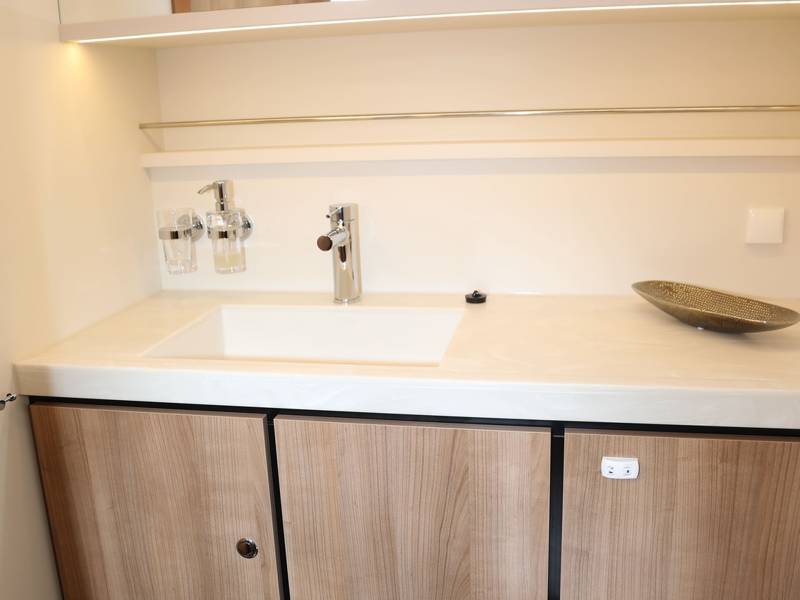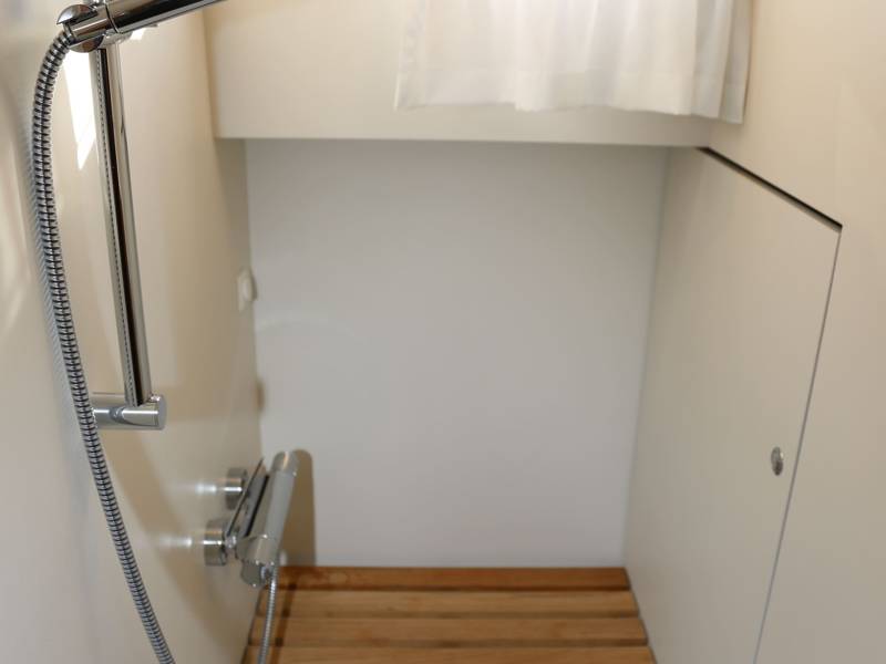 The two sanitary rooms have an electric toilet and sink and one separate shower room with teak bench. The ship has a boiler (24 litres) for sufficient hot water. Along the gangways you can easily step on either side of the ship or on the bathing platform.