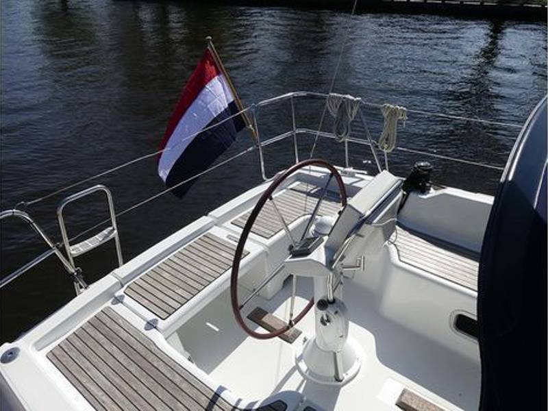 The mainsail (with maindrop system) and the Genoa (furling jib) can be operated from the cockpit with the self-tailing winches. The steering wheel is equipped with a compass, GPS, log and depth gauge. The cockpit offers space for six adults and has a cockpit table. The gas bottles are safely located outside on the aft deck in a locker. Also on board is a VHF radio, radar reflector, lifelines and binoculars. An emergency tiller and a shower with cold water on the bathing platform with bathing ladder. Docked in a harbor you connect the shore power so that you have power (220 volts).